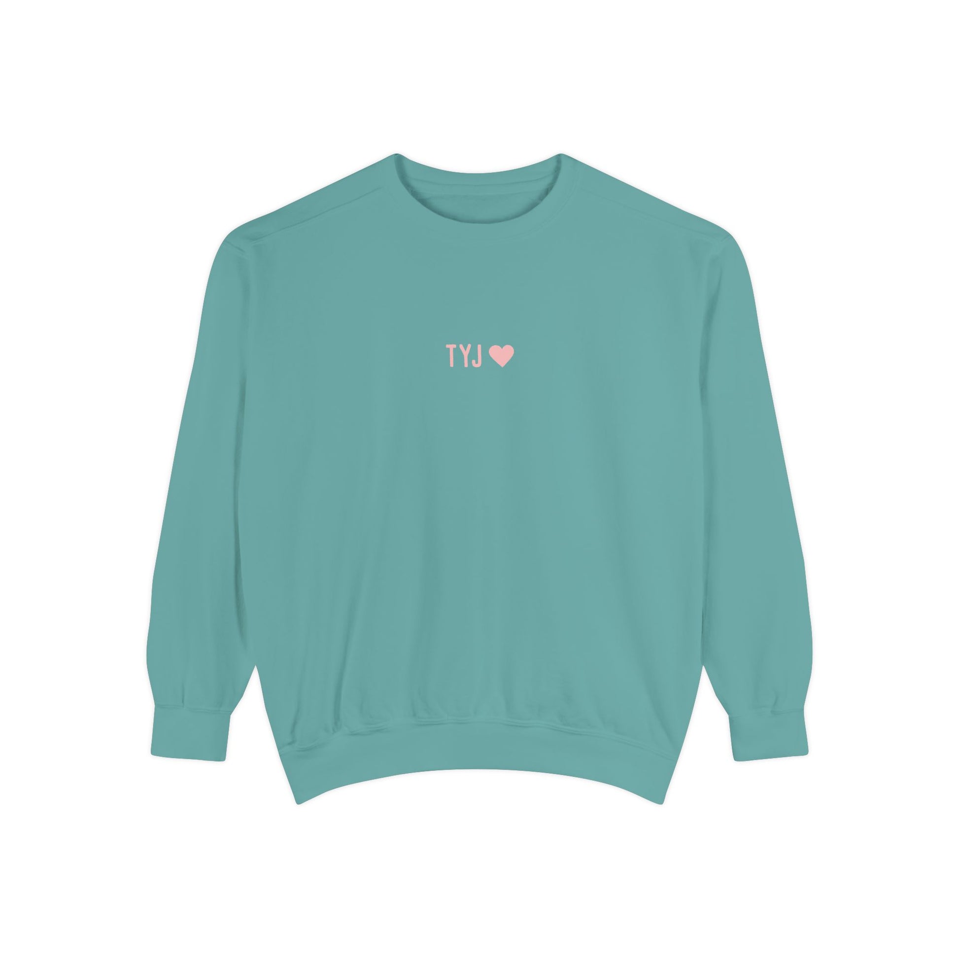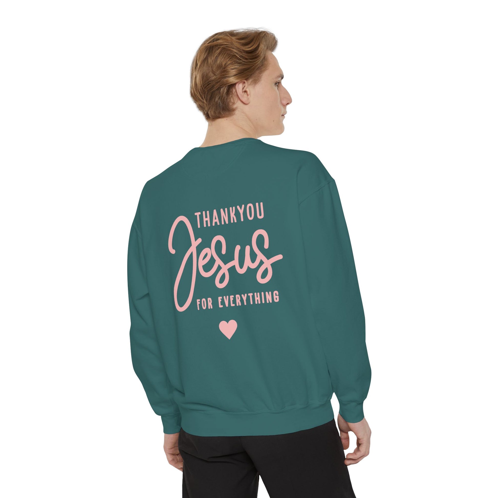 This relaxed sweatshirt brings quiet, everyday faith into soft, wearable form. The front carries a small, tender “TYJ ♥” while the back blooms with a gentle script: “Thank you Jesus for everything” and a tiny heart beneath. It feels like a warm pause between errands and evening prayers — the kind of layer you reach for when you want to feel grounded and grateful. The medium-heavy fabric and garment-dyed finish give it a lived-in softness that settles comfortably over jeans or lounge pants. Subtle enough for daily wear, the embroidered-ready chest areas add an option for tactile detail and heirloom-quality personalization.